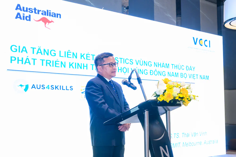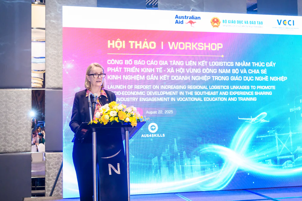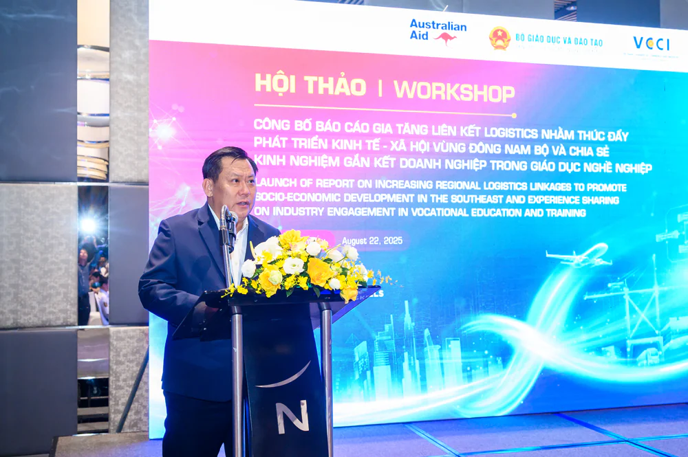 On August 22, 2025 – Vietnam Chamber of Commerce and Industry – HCMC Branch (VCCI-HCM), in collaboration with the Australian Embassy via the Aus4Skills Program, has recently launched the research report titled “Increasing Regional Logistics Linkages to Promote Socio-Economic Development in the Southeast”. The Workshop welcomed over 130 delegates, including leaders and representatives of the following entities: Mr. Vo Tan Thanh – Vice President of VCCI, Ms. Sarah Hooper – Australian Consul-General in Ho Chi Minh City, Mr. Brent Stewart, Deputy Consul-General of Australia in Ho Chi Minh City, Mr. Huynh Van Son – Vice Chairman of Tay Ninh Provincial People’s Committee, Mr. Truong Anh Dung, Director General of the Directorate of Vocational Education and Training, Ministry of Education and Training, Mr. Tran Ngoc Liem – Director of VCCI-HCM, Ms. Bui Thi Ninh – Deputy Director of VCCI-HCM; representatives of the Departments of Industry and Trade, Departments of Construction, Departments of Finance of Ho Chi Minh City, Dong Nai Province, Tay Ninh Province; Regional Customs Sub-departments; Business Associations, and many businesses in the logistics and manufacturing sectors.